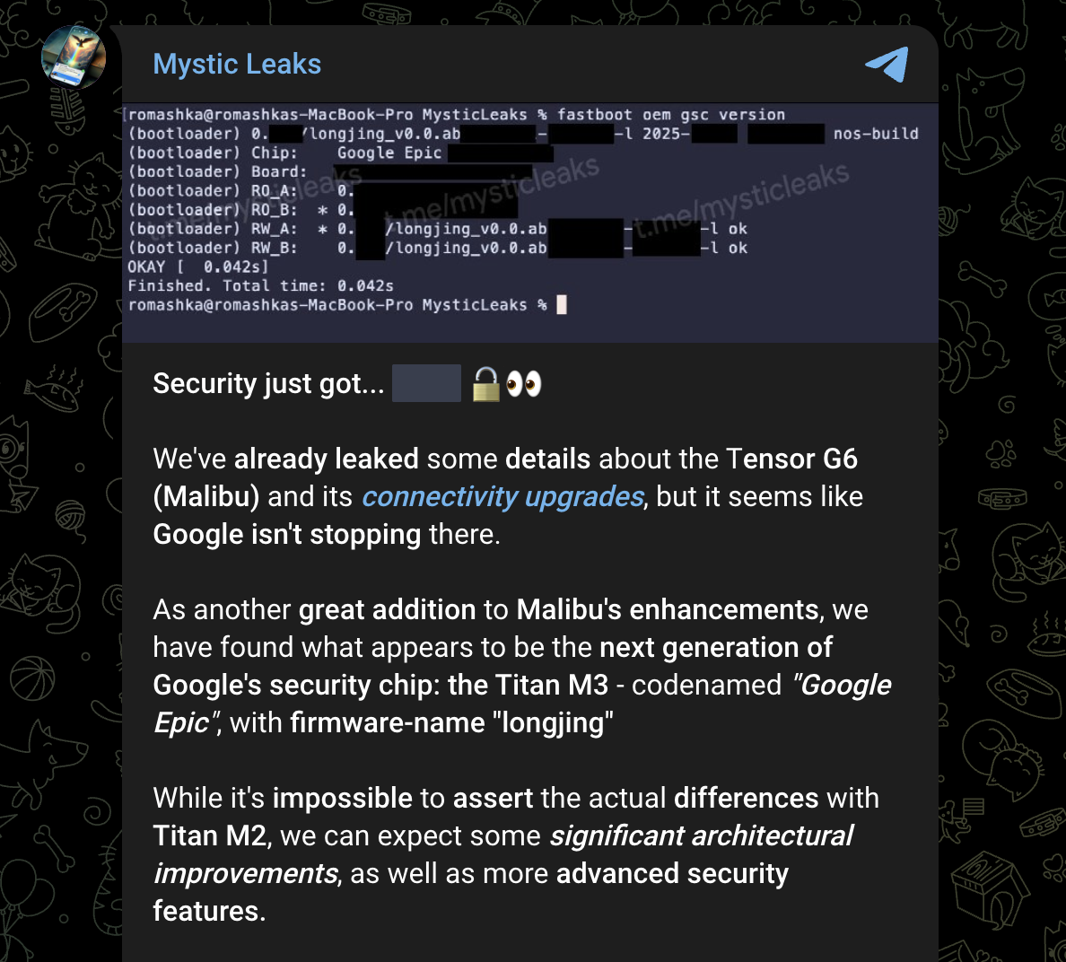 据爆料人士 Mystic Leaks 所述,谷歌正准备为 Pixel 11 系列手机的 Tensor G6 芯片引入 Titan M3,代号“Google Epic”,运行的固件名为“longjing”,有望将智能手机的安全提升到新高度,成为“最安全手机”之一。