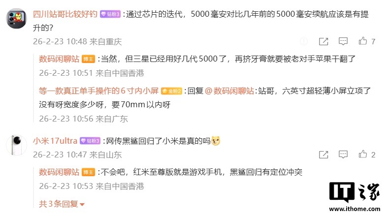 博主 @数码闲聊站 今日发文:三星 S26 Ultra 真机释出了,6.9"2K M14 四等边直屏,200MP HP2 主摄 +50MP 超广角 + 10Mp 3X 小底中焦 +50MP 5X 潜望长焦,4.74GHz 高配版骁龙 8E5,5000mAh 电池。
