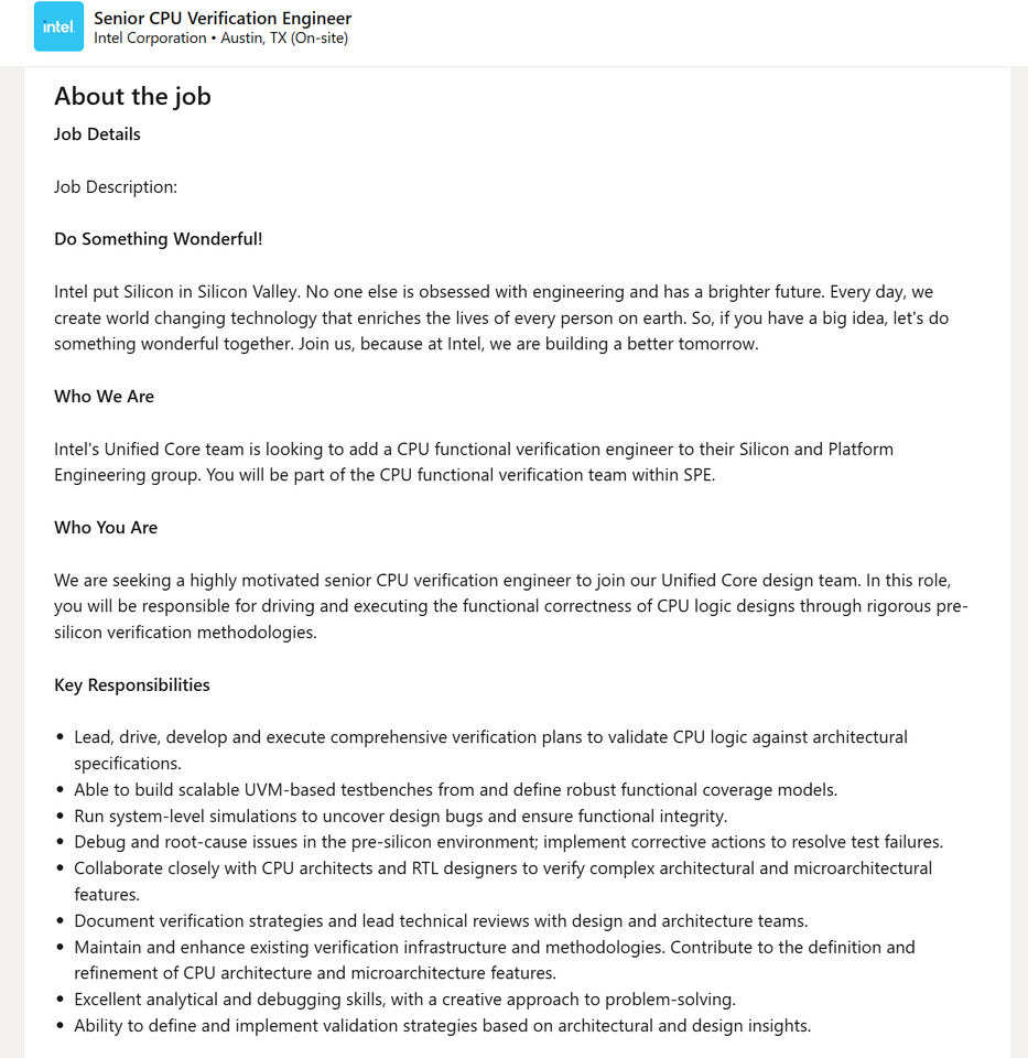 IT之家 2 月 23 日消息,英特尔官方前天在领英平台发布招聘告示,显示该公司正在组建一支“统一核心”(Unified Core)设计团队,负责开发下一代 CPU 的全新微架构。