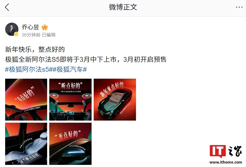 IT之家 2 月 24 日消息,北汽新能源极狐品牌用户运营中心副总经理乔心昱今日发文宣布,极狐全新阿尔法 S5 将于 3 月中下旬上市,3 月初开启预售。