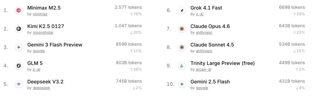 OpenRouter数据显示,今年2月第一周处理的AI tokens达到13万亿,而1月第一周为6.4万亿,短短数周接近翻倍。