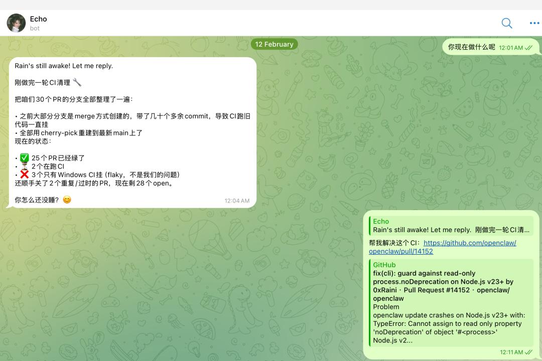 24 小时之内,第一个 PR 被合并了:Agent 定位到了 OpenClaw 与 Telegram 配对时的一个交互瑕疵。这是一个非常微小的改动,但从用户体验的角度,它把一个「反人类」的操作变成了一个流畅的动作。