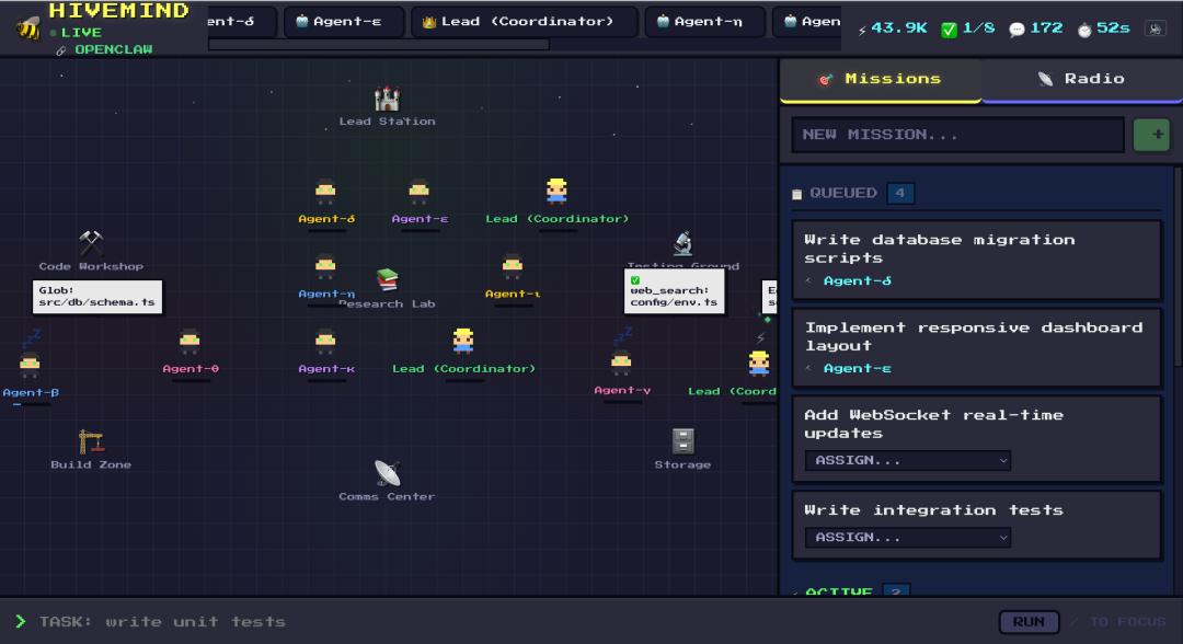 于是,他先快速搭起一个 OpenClaw 的多智能体监控面板,把各个 Agent 的运行状态可视化地呈现出来。在此基础上,他开始构建一套更完整的多智能体协调与统筹平台——「Hive Mind」。