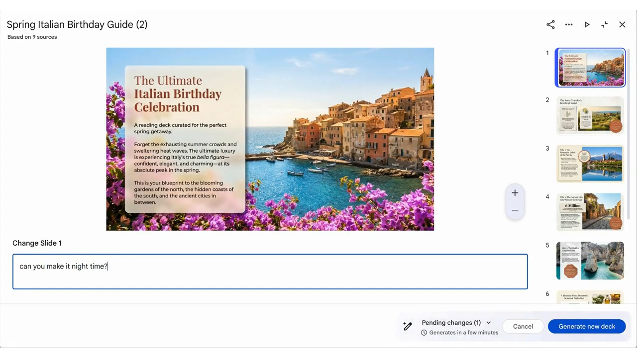 目前所有 NotebookLM 用户均可使用基于提示词的修改功能。相较于其它方式这意味着更高的修改精确度,可确保每张幻灯片的文本、颜色、视觉效果都完全符合用户的需求。