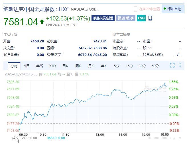 纳斯达克中国金龙指数涨1.37%。