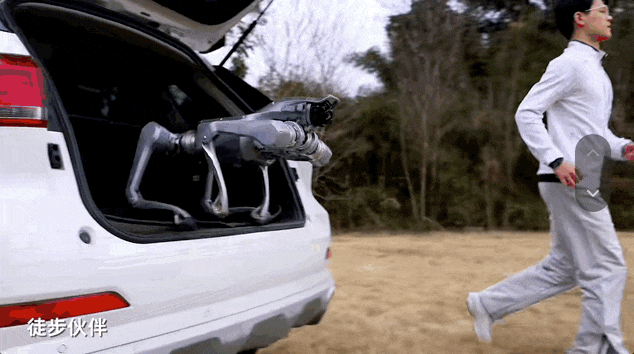 在视频一开头,Unitree As2从车上一跃而下,跟随一位男士开始跑步,显示出这款产品类似于消费级四足机器人的轻量化体格,字幕“徒步伙伴”也展现出其可以用于运动陪伴场景。