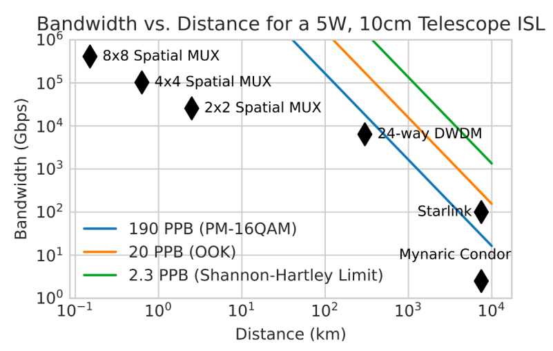 Google论文中关于提升卫星间传输带宽方案的带宽与距离的关系