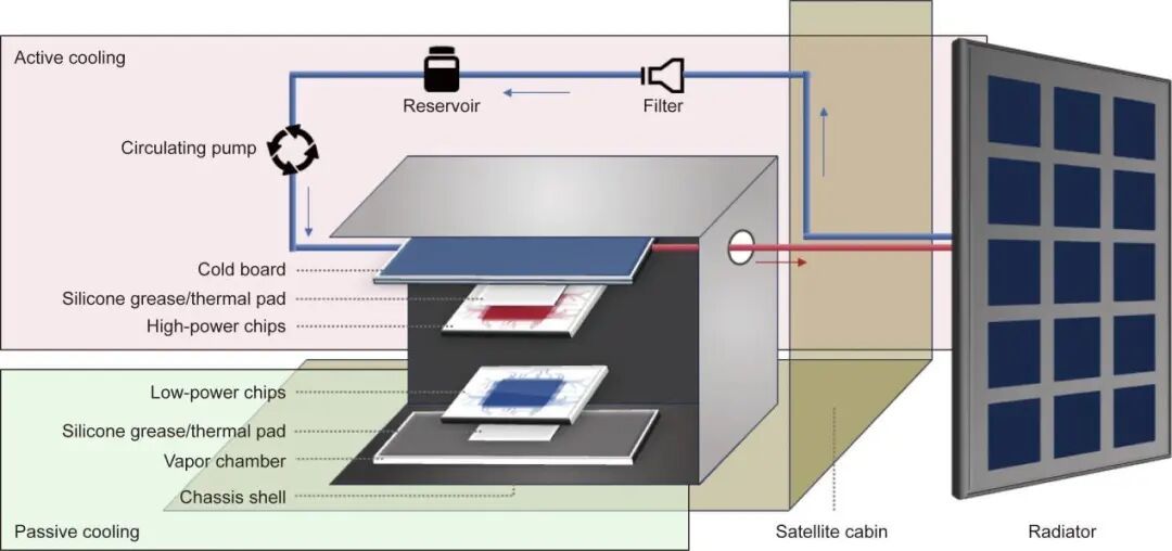 我们知道太空中是没有空气的,只能靠热辐射散热,这个散热效率极低,目前看相对可行的解决方案是配置流体回路和辐射散热器。
