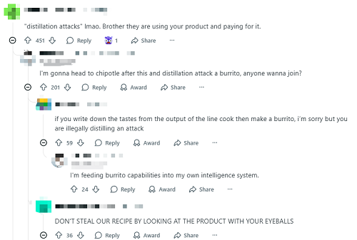 Anthropic将蒸馏行为称为“蒸馏攻击”,这一说法本质上也有些“文字游戏”的嫌疑。多位Reddit网友认为,即便其他公司确实利用其产品生成的数据进行训练,这本质上也只是用户在正常使用产品,而且这些用户是付了费的。