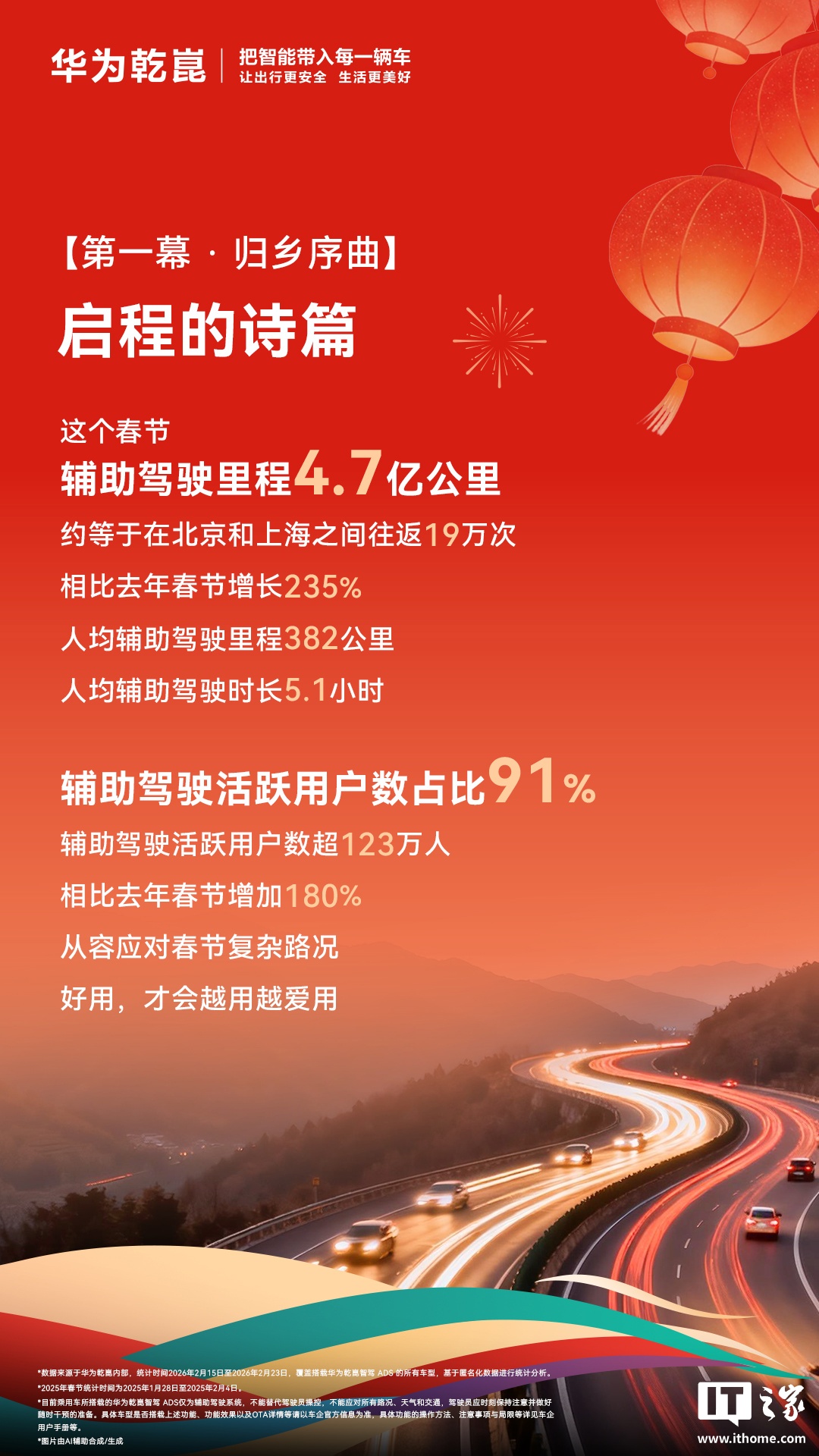 IT之家 2 月 25 日消息,华为乾崑智能汽车解决方案官方微博昨日发布了春节出行报告。