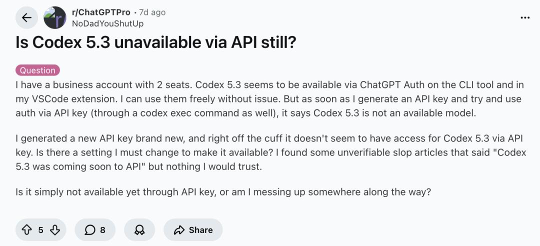 但也有不小比例的用户发出了批评:有用户指出目前 GPT-5.3-Codex尚未通过 API 向所有开发者开放,部分平台(如通过 API key)无法直接调用最新模型,这让许多开发者难以在自定义环境中集成。