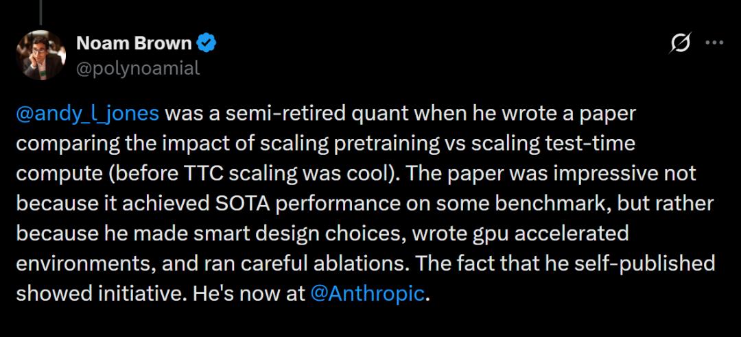 Andy Jones是一位半退休的量化分析师,在测试时计算还没火起来之前,他就写了一篇论文,毕竟了比较了扩大预训练规模和扩大测试时计算量的影响。
