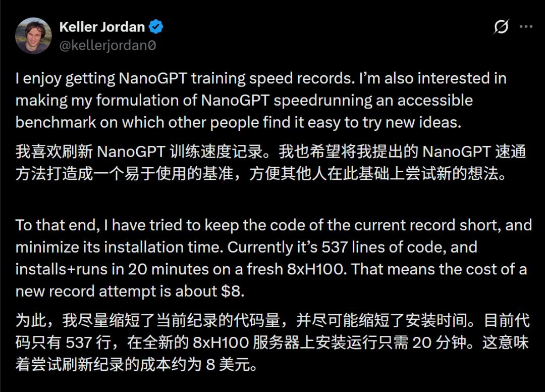 为此,他刻意做了几件事,比如让代码压缩到极简,只有537行;在8×H100的全新环境下,让安装和运行的时间仅为20分钟;甚至单次的尝试成本,低至8美元。