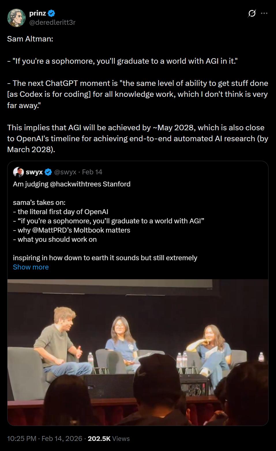 但现在,他的原话是:「现在,到了2026年,我们正处于另一个AGI即将到来的临界点——也许在未来五年内」。