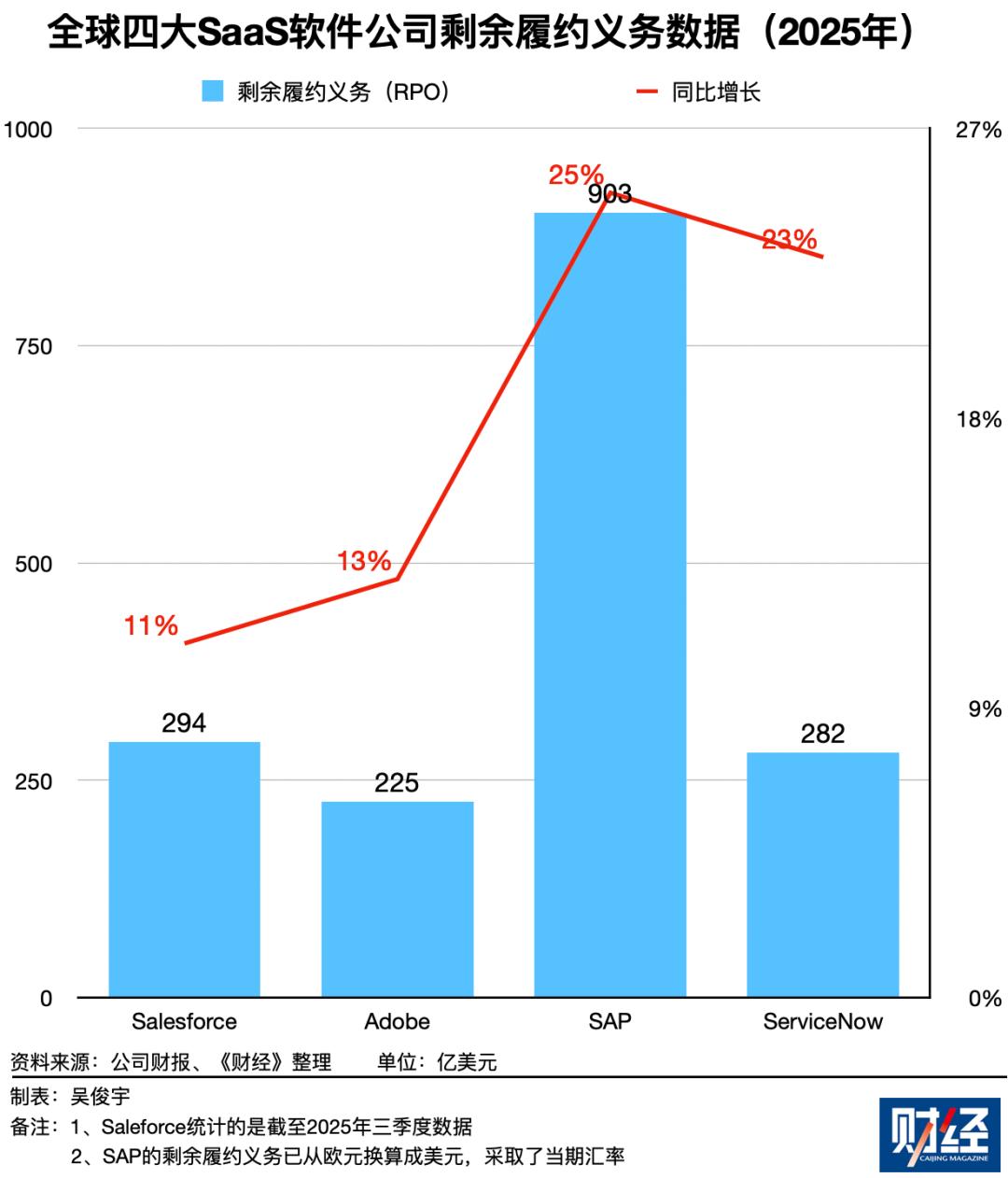 过去一年,即使在“SaaS末日”情绪不断蔓延的阶段,Salesforce、Adobe、SAP、ServiceNow的RPO仍在持续增长,且RPO增速高于当年营收增速。截至2025年末,Salesforce、Adobe、SAP、ServiceNow的RPO营收增速分别是11%、13%、25%、23%。