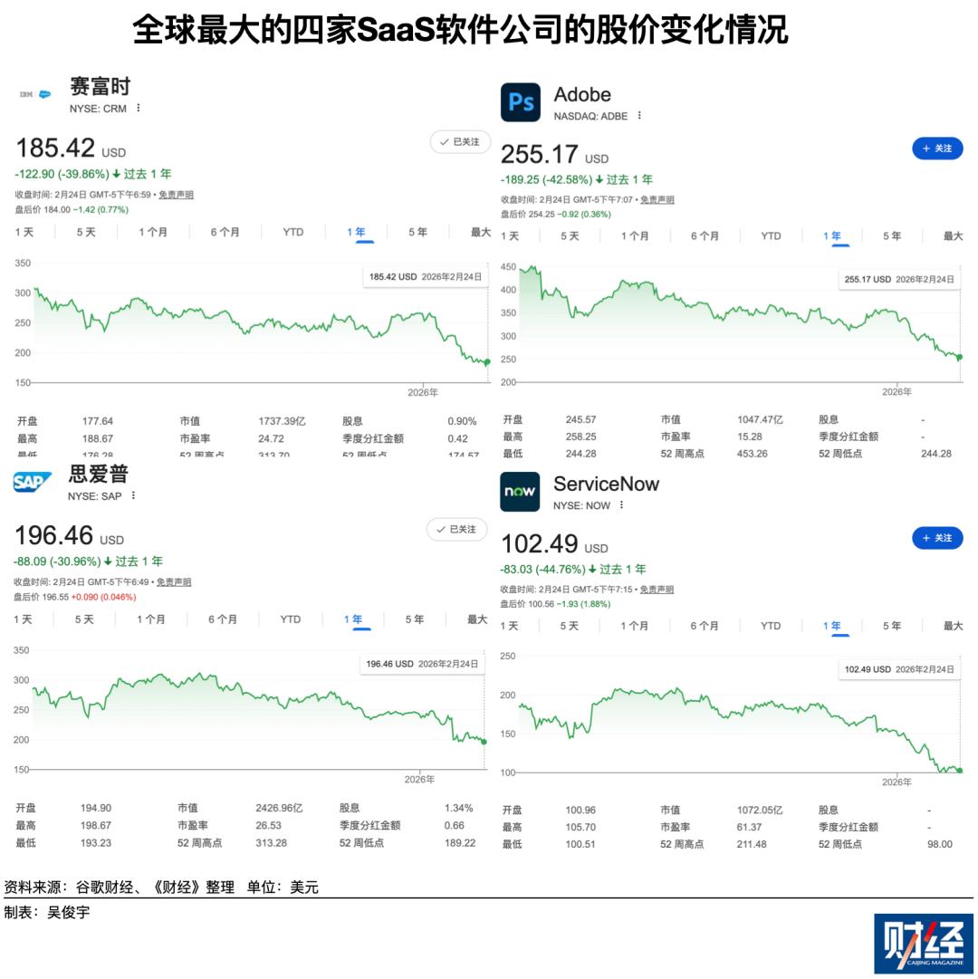 事实上,“软件将被AI颠覆”的悲观情绪早在2025年初就在酝酿。过去一年,美国SaaS软件公司市值一路下跌。Salesforce、Adobe、SAP、ServiceNow在2025年2月24日-2026年2月24日股价均下跌30%以上。Claude Cowork只是让“软件末日”情绪到了爆发临界点。