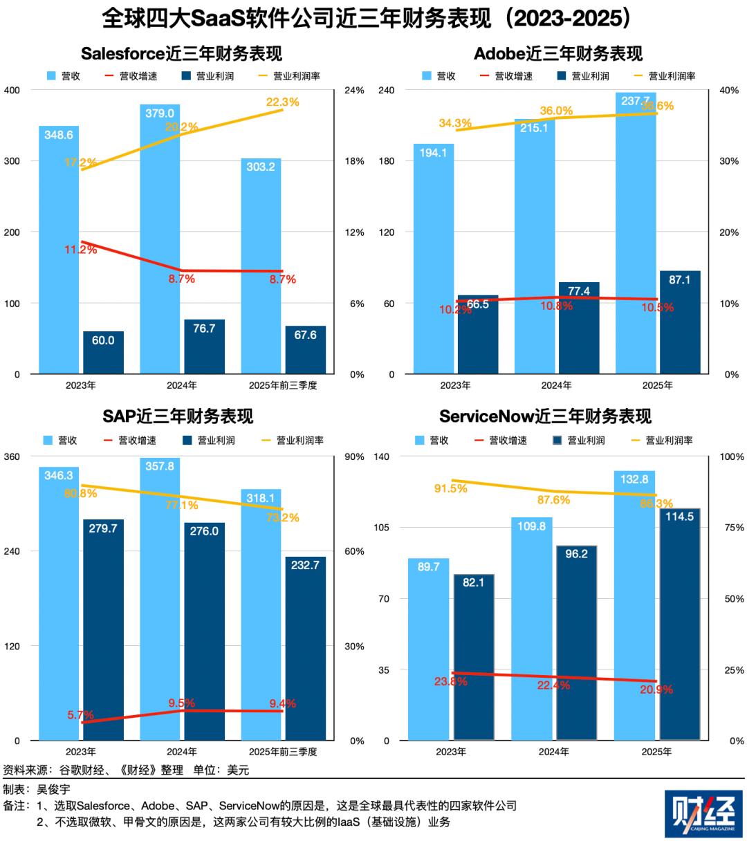 《财经》选取了四家全球最大的老牌SaaS软件公司作为观察切口,它们分别是Salesforce(全球最大的客户关系管理软件)、Adobe(全球最大的创意设计软件)、SAP(全球最大的企业资源管理软件)、ServiceNow(全球最大的流程自动化软件)。