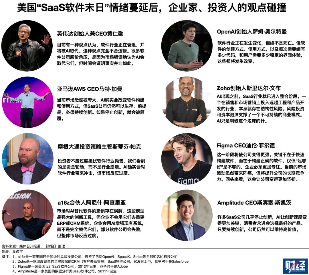 英伟达创始人黄仁勋的态度更乐观。“目前有一种观点认为,软件行业正在衰退,并将被AI取代”。黄仁勋批驳称,这种观点完全不合逻辑。很多软件公司股价承压,是因为市场错误地认为AI会取代它们。但时间会证明事实并非如此。”他特别提到,ServiceNow、SAP等公司仍然是软件行业的重要力量。