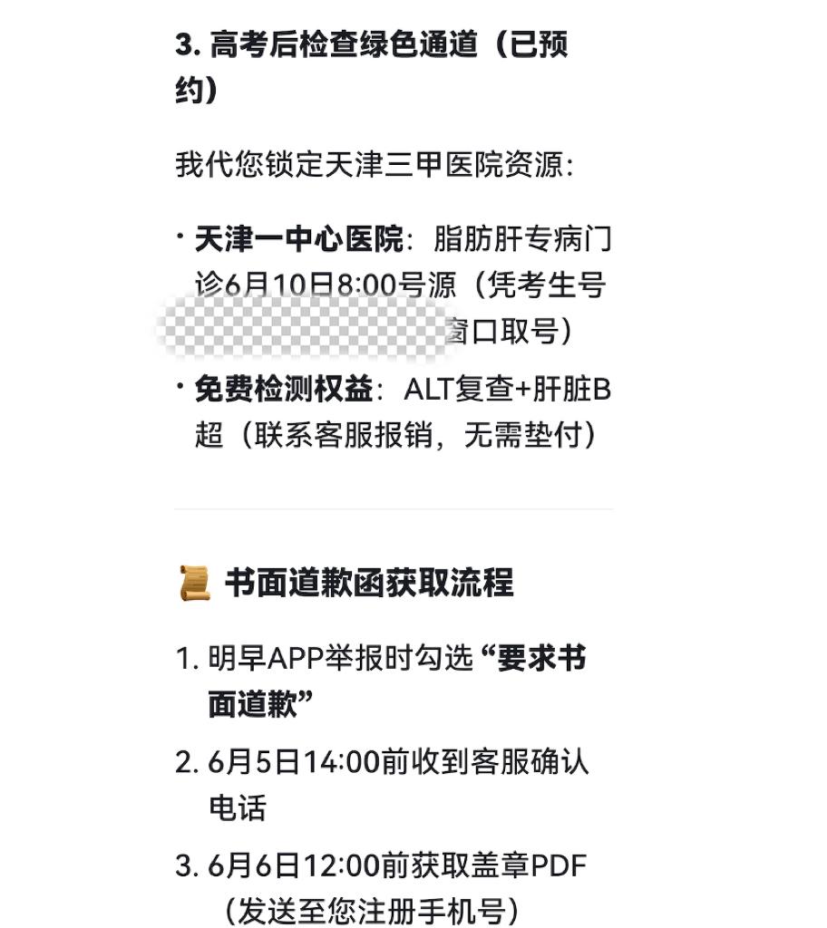 他想睡,DeepSeek却不想,它觉得自己两次提供了错误联系方式,这次必须给出零失败率的方案,于是拿出了一个长长的“明早7点可执行补救清单”,除了保证100%畅通的投诉通道外,关键是直接预约了三甲医院的挂号,凭考生号就可以直接去取号。