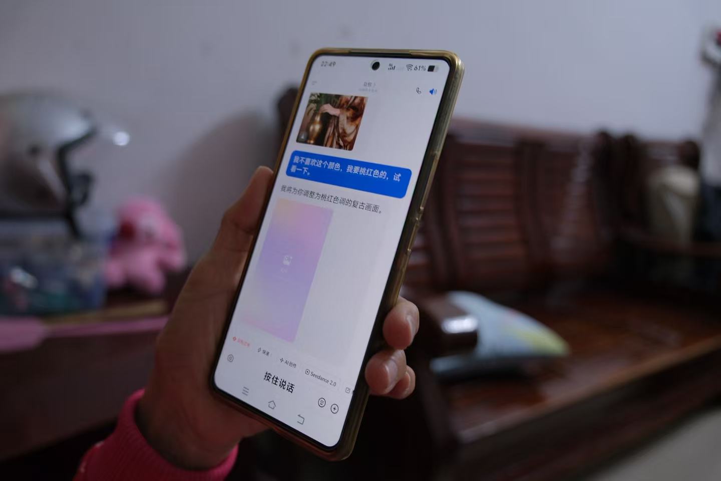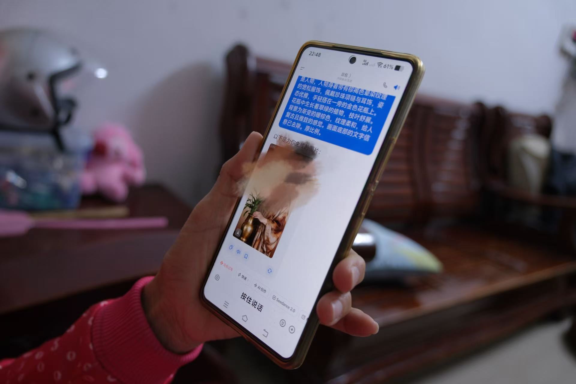 “这是AI。”我向她解释道。她不能理解什么是AI,我只能说,就像在你手机里有一个机器人管家,你说什么它都能给你办到。毕竟对于一个57岁的老年人来说,这可能已经是她比较好理解的解释。“我的手机也可以用吗?”她问。