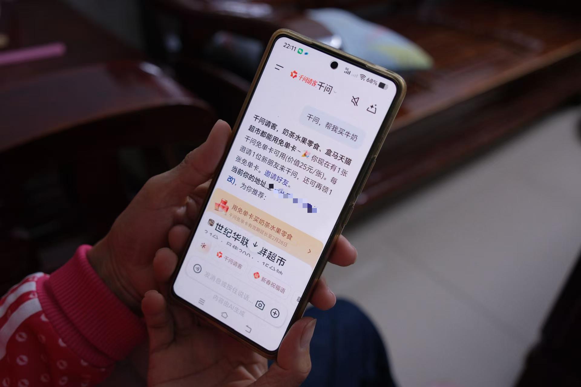 但实际上她并不知道什么是千问,也不知道为什么这个App可以一句话就买到东西。她还跟我说,表嫂用千问买了好多奶茶,但是这边外卖没有奶茶可以点,自己点不到。