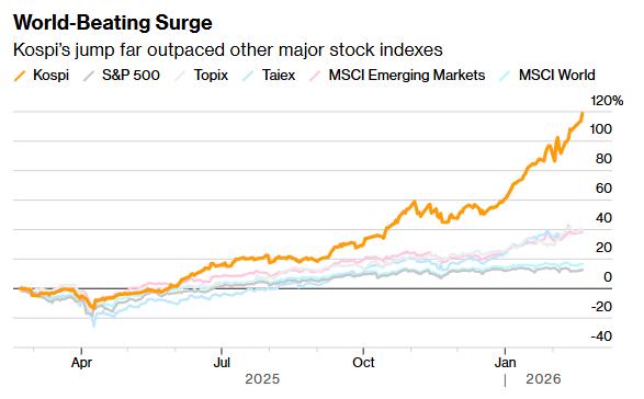 分析人士指出,尽管长期以来因估值不振而被外国基金忽视,但韩国股市现已成为全球市场中愈发闪耀的明星。所谓的“AI恐慌交易”眼下已被证明反而对该国股市有利,因为在韩国市场上,软件股只扮演次要角色,而硬件制造商持续推动市场走高。