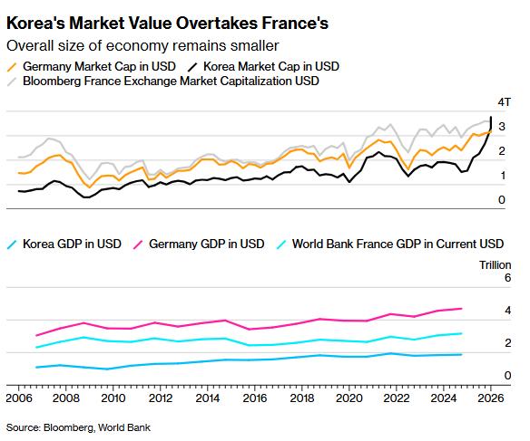 根据业内汇总的数据显示,韩国股市的市值当前已达到逾3.76万亿美元,自2025年初以来累计攀升了约2.23万亿美元。目前,韩国股市市值已超越法国股市,升至全球第九。而在更早之前,韩国股市市值在1月下旬已超越了德国股市,历史性地跻身全球前十市场之列。