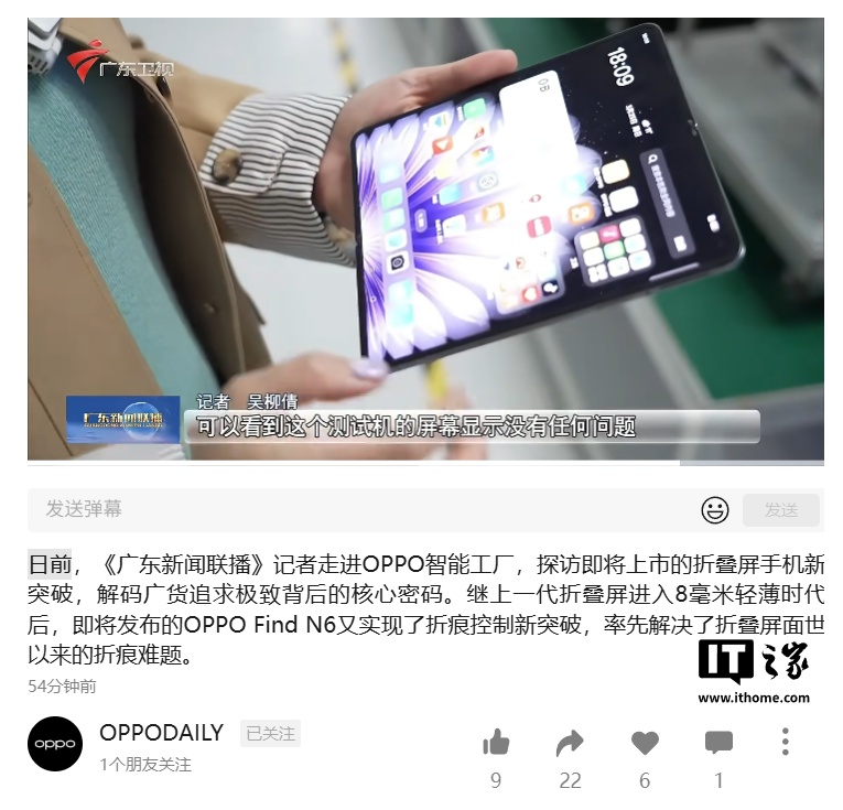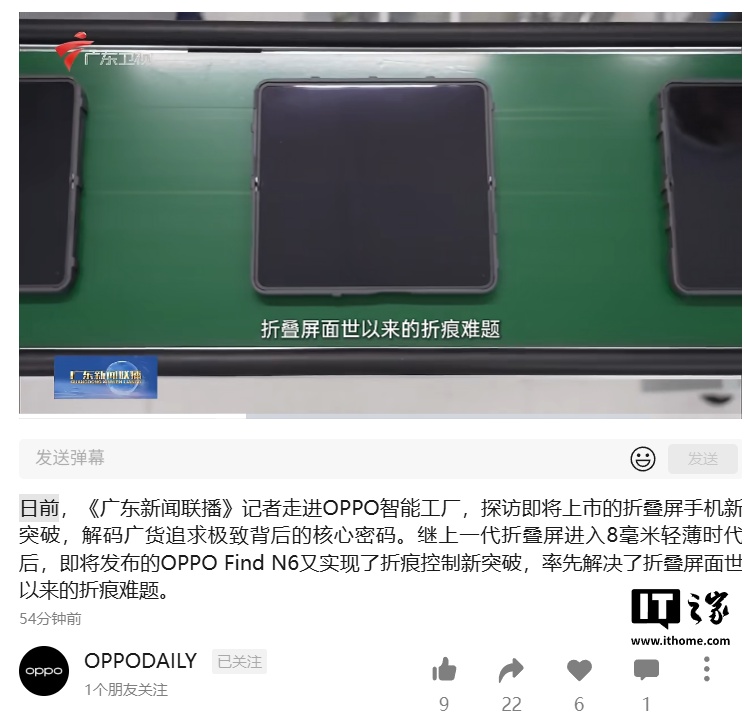 IT之家 2 月 26 日消息,据 OPPO 官方今日消息,《广东新闻联播》日前走进 OPPO 手机生产一线,探访即将上市的 OPPO Find N6 折叠屏手机。