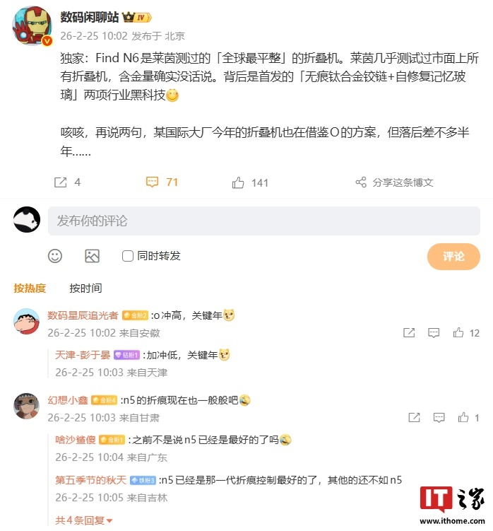 博主 @数码闲聊站 发文透露,OPPO Find N6 是莱茵测过的“全球最平整”的折叠机。博主表示,莱茵几乎测试过市面上所有折叠机,含金量确实没话说。