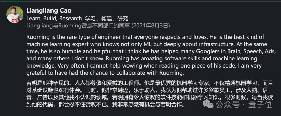 从谷歌同事对他的评价来看,庞若鸣不仅精通机器学习,更重要的是还懂基础设施。