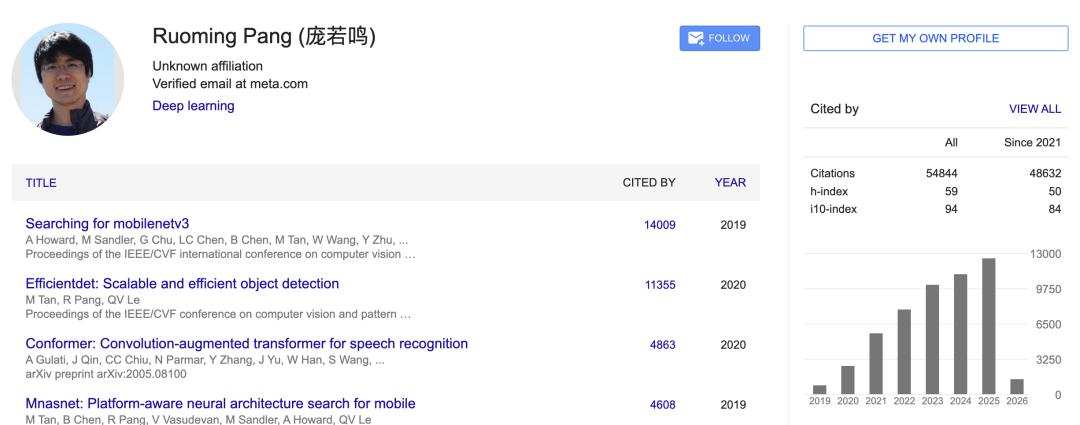 单看学术履历,庞若鸣的成果也相当亮眼。谷歌学术显示,其论文总引用量达5w+。
