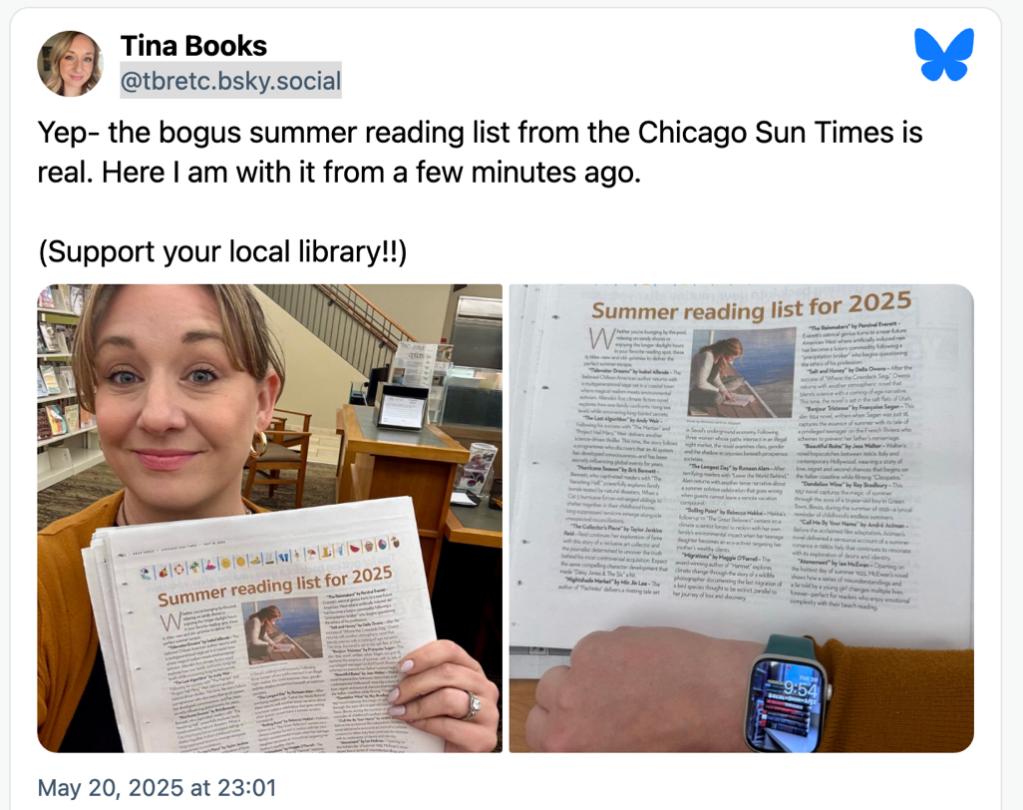 《芝加哥太阳报》此前刊登过一个“2025 年夏日书单”,结果入选的书大量是 AI 套用真实作者名字后写的假书|Bluesky