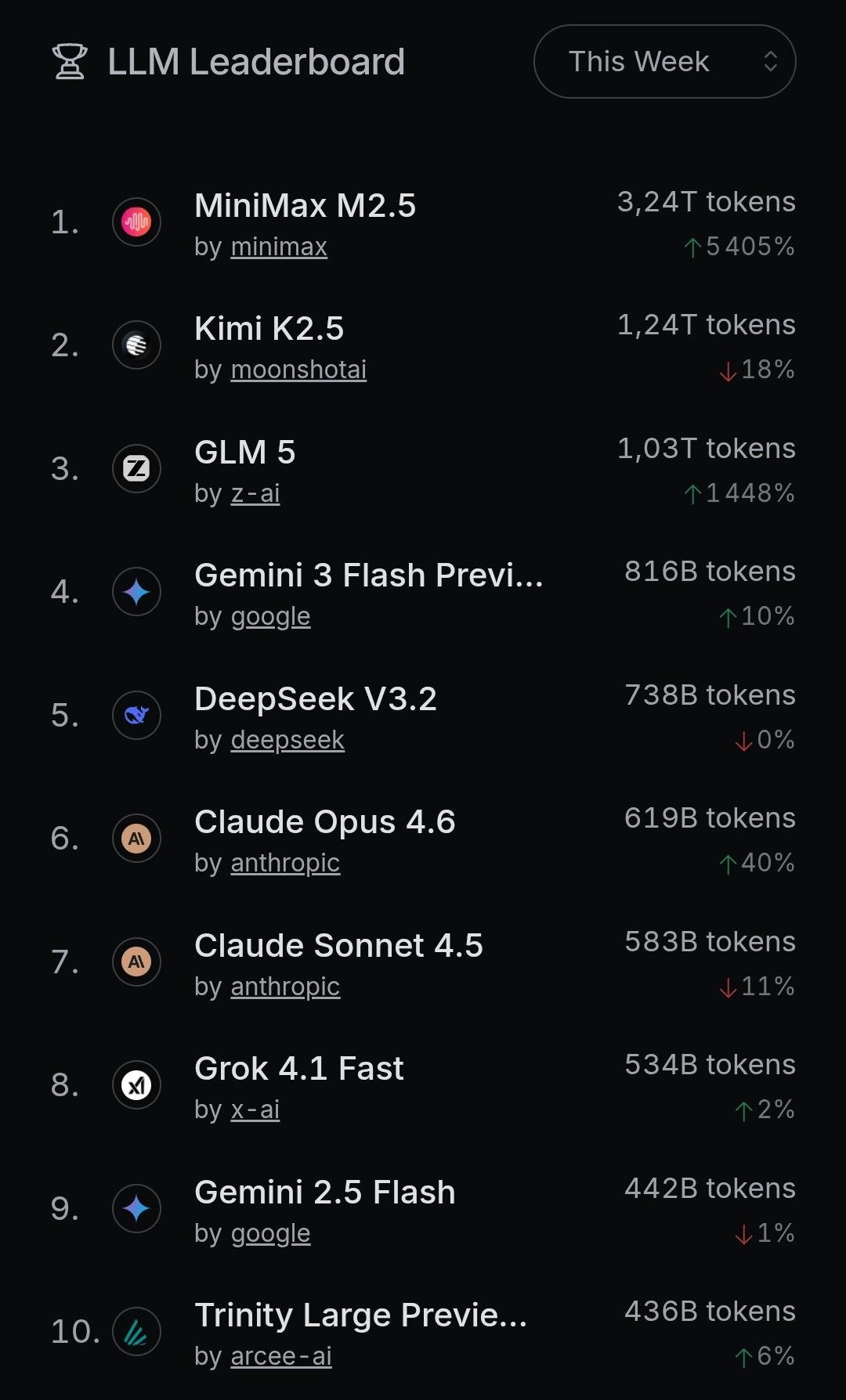 在 OpenRouter 本月(2026 年 2 月)的具体排名中,中国大模型表现极为抢眼。发布仅两周的 MiniMax M2.5 模型斩获单月冠军,开发者通过该平台调用了高达 4.55 万亿个 Token(Token 是 AI 处理输入数据的基本单元)。
