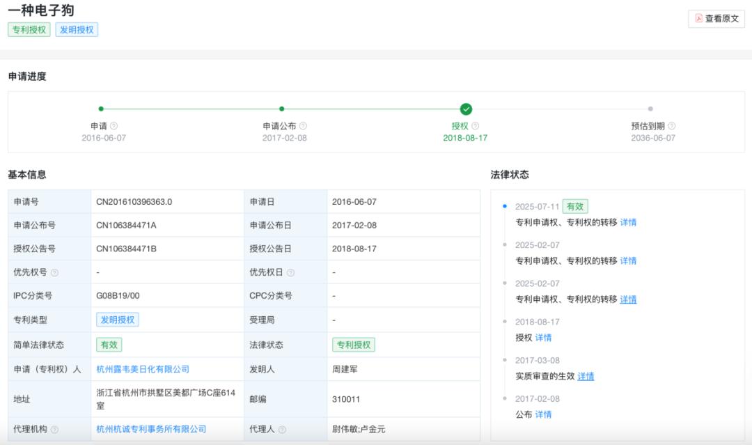 值得一提的是,本次专利纠纷案件涉及的“一种电子狗”发明专利,最早于2016年提起申请,后于2018年获得授权。