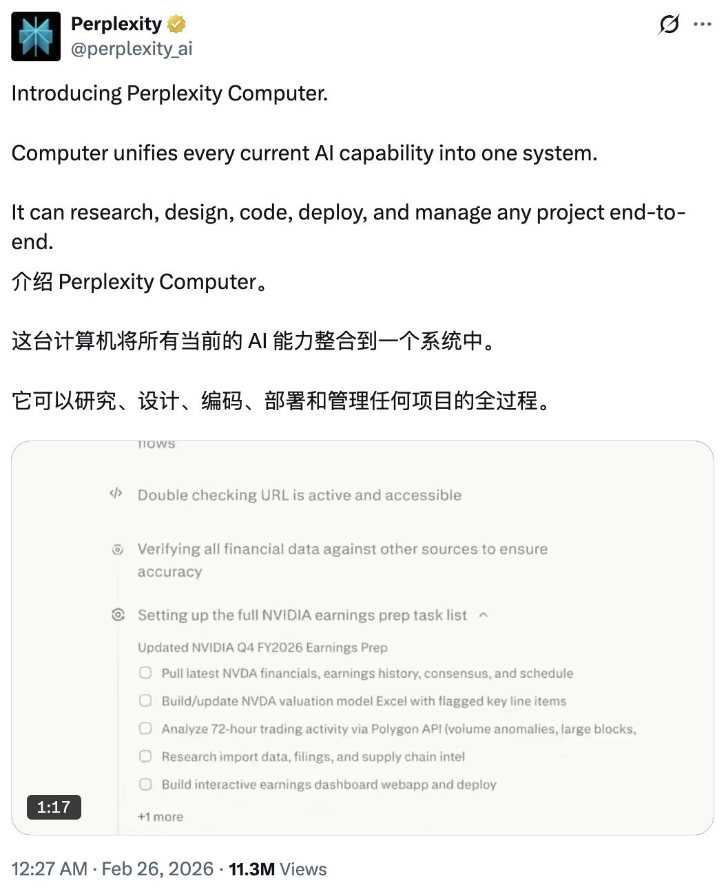 26日,AI 独角兽 Perplexity 扔出一个新东西:Perplexity Computer,一个可以直接操控电脑的通用 AI 系统。官方号称它可以从研究、设计、写代码,到部署、管理,一个项目全流程跑完。