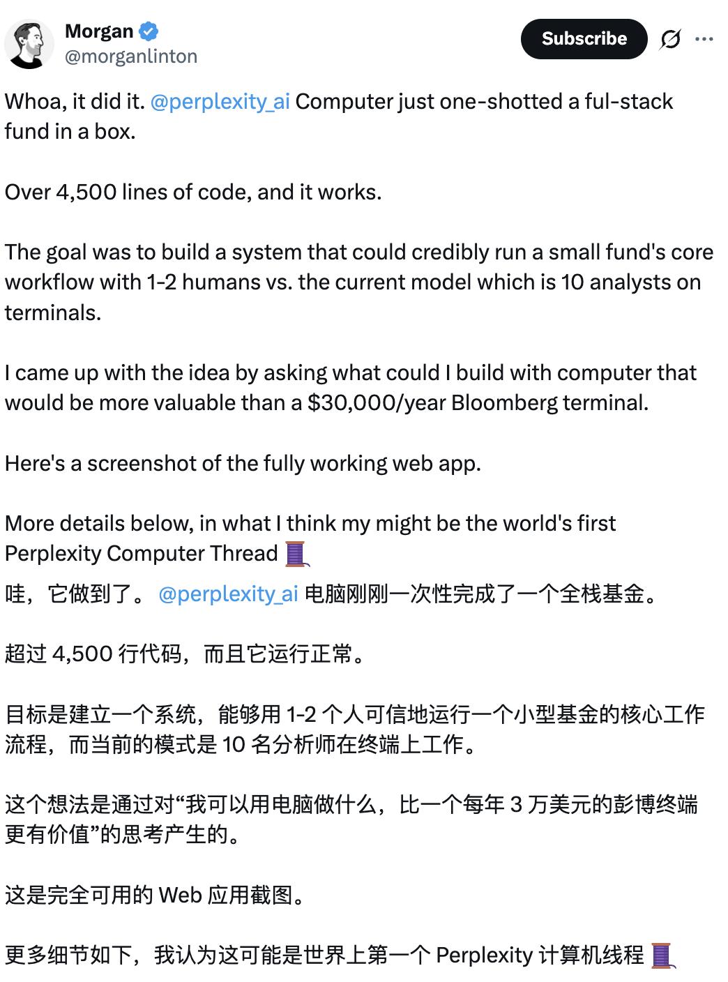 而 Perplexity Computer 这边,只需订阅 Perplexity Max,一年 2000 美元。价格大约是彭博终端年费的1/12。