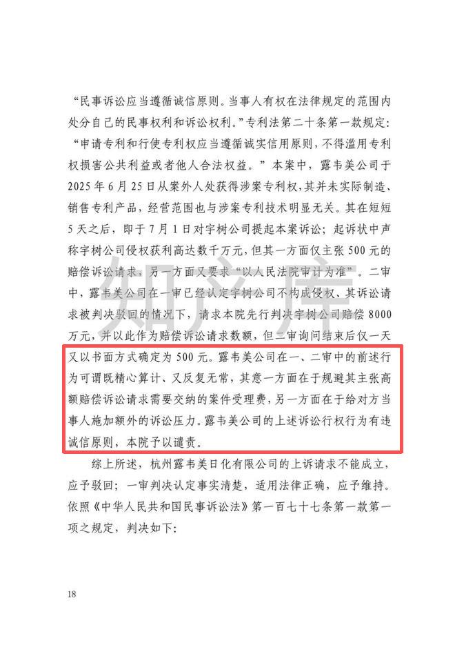 最高人民法院在二审中指出,露韦美公司于2025年6月25日获得专利后未实际制造、销售专利产品,经营范围与专利技术无关,在短短5天之后,即向宇树科技提起诉讼。其在一审中主张500元赔偿却要求审计,二审中先提出8000万元赔偿并申请先行赔付,次日又调回500元,行为 “既精心算计、又反复无常”,实则是为规避诉讼费、向宇树科技施加额外诉讼压力,该行为违反诚信原则,法院予以谴责。