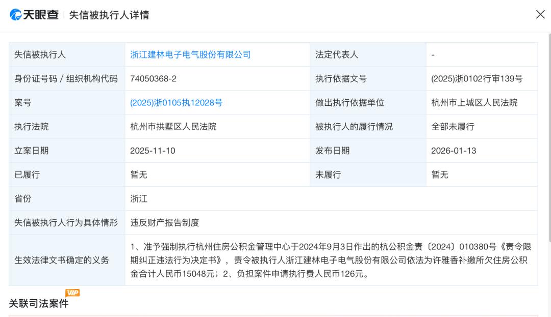 并且, 建林电 气历史上12次成为被执行人,6次被列为限制高消费企业。2026年1月,建林电气因补缴所欠住房公积金合计1.5万元,再次成为失信被执行人。
