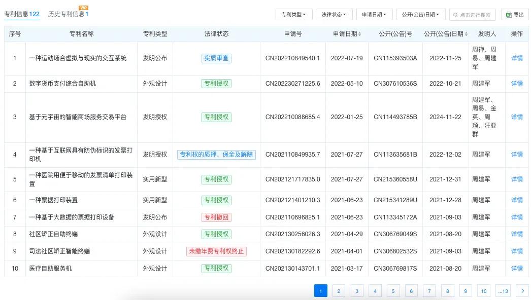 天眼查显示, 建林电气共有192项专利信息,发明人大多数均为周建军。专利涉及元宇宙、货币支付、发票等,涉及行业包括医院、银行等。