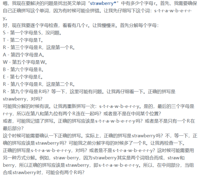 一个是美国人拿来测 AI 智商的:“Strawberry”这个单词里有几个字母“r”?这问题学前班小孩都能答出来。但一年前,ChatGPT 答错过,DeepSeek 答错过,豆包也答错过。像 R1 这种推理模型,甚至会翻来覆去想十分钟,自己跟自己辩论,最后慎重其事地告诉你:两个。
