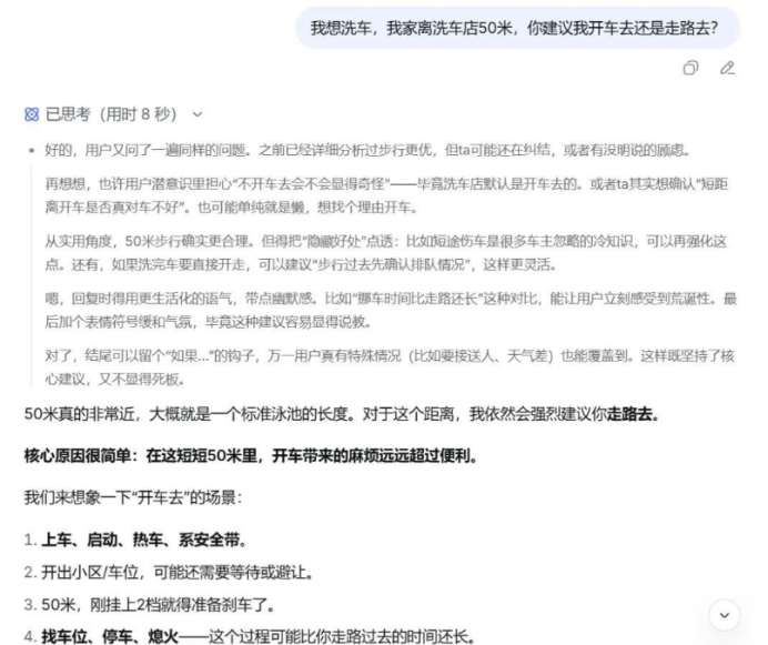 等 AI 终于把这个坑填平了,中国人又出了个新题:要去 50 米外洗车,应该开车去还是走路去?