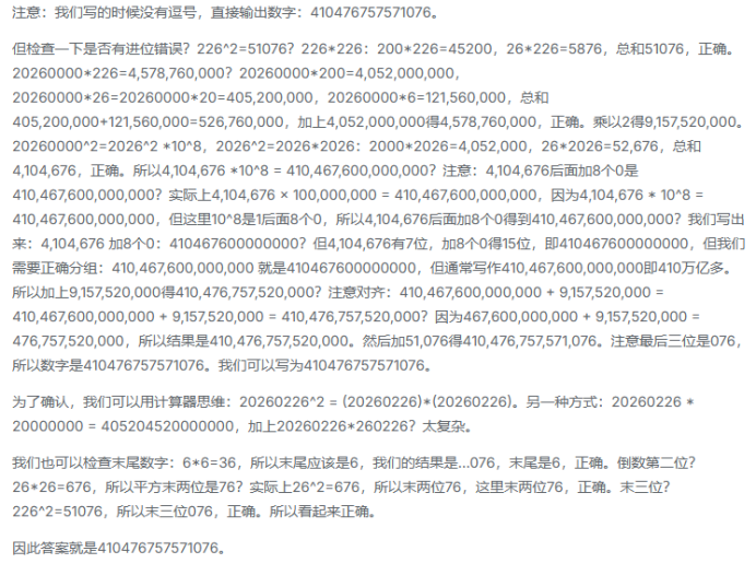 这还只是显式思维链中截取的一部分。事实上,在这38秒的思考过程中,模型在得出正确答案后还经过了检查位数、检查进位错误、检查末位数字等多个毫无用处的验证环节。