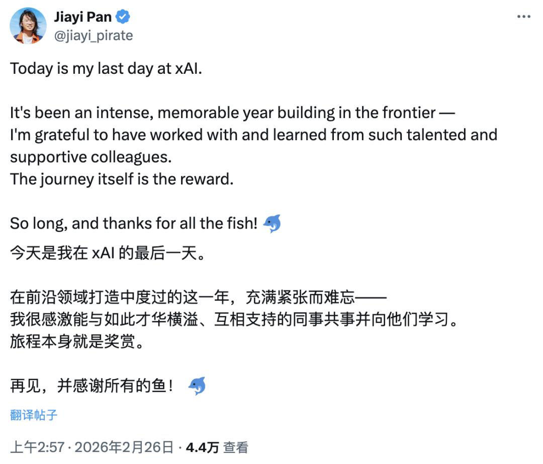 2月26日,xAI Grok 4团队核心成员Jiayi Pan宣布离职