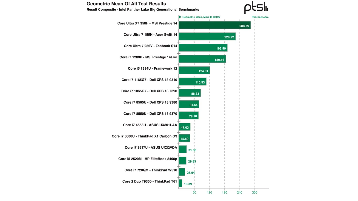 IT之家 2 月 28 日消息,科技媒体 Phoronix 在最新一期硬件测试中,全面测试英特尔过去 18 年间推出的 15 款移动处理器,揭示了从 45 纳米 Penryn 架构到 18A Panther Lake 架构的演进之路。