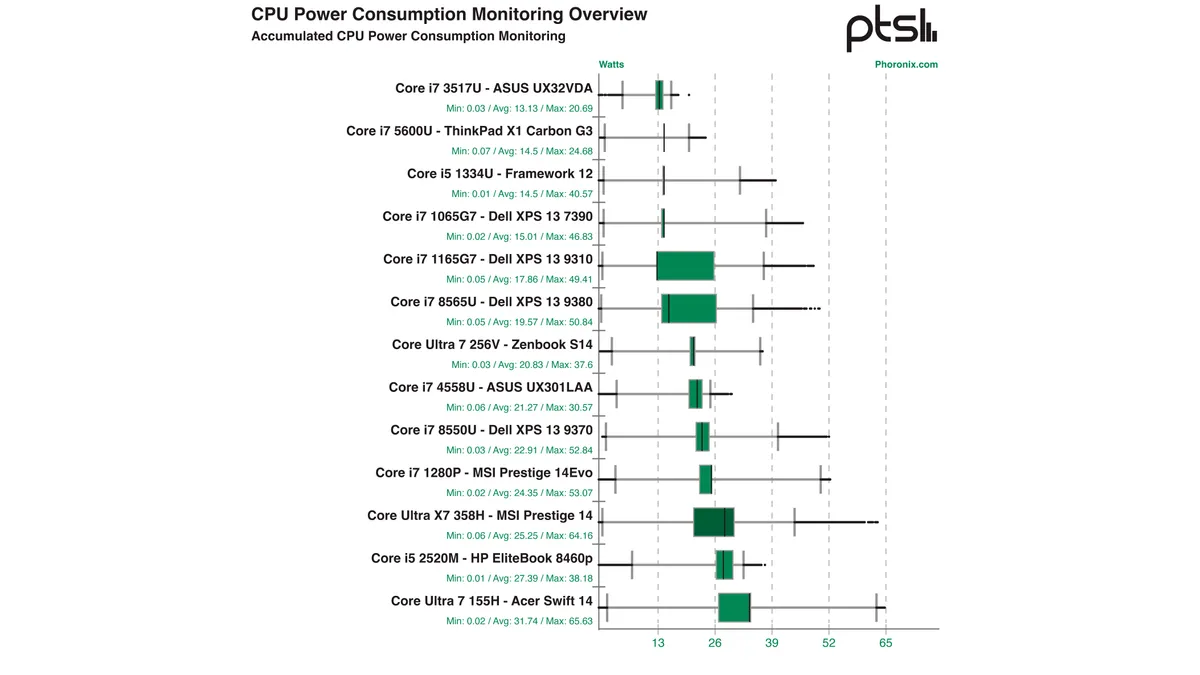 该媒体在 Ubuntu 26.04 系统环境下,共计测试 15 款英特尔移动处理器,涵盖从 2008 年的 Penryn 架构(Core 2 Duo T9300)到即将面世的 Panther Lake 架构(Core Ultra X7 358H)。IT之家援引原文内容,附上评测的 15 款处理器如下: