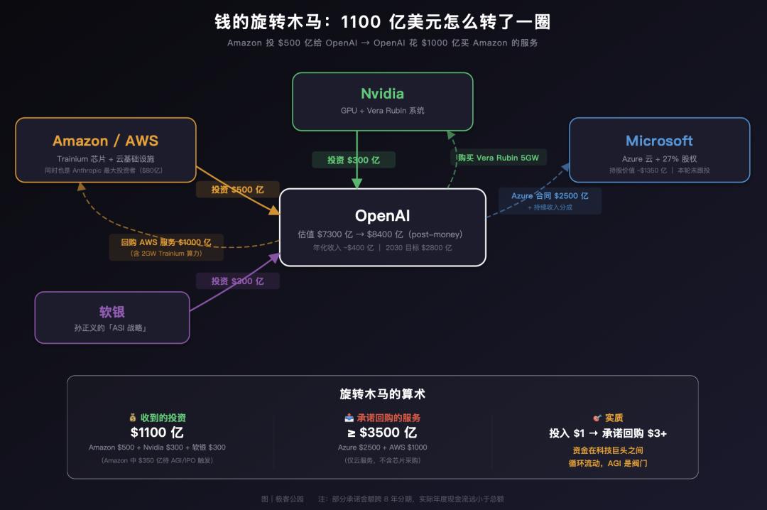 Amazon 先给 OpenAI 500 亿,OpenAI 再花 1000 亿买 Amazon 的服务。资金在两家公司之间转了一圈又回来了,只是中间多了几份合同和一个叫「AGI」的触发器。