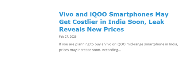 【CNMO科技消息】自2025年下半年起,因存储芯片成本不断攀升,数码电子行业掀起涨价潮,手机、电脑、平板等产品价格纷纷上扬。如今,这股涨价风潮即将蔓延至印度市场。据外媒报道,vivo及其旗下品牌iQOO等将上调多款手机在印度市场的售价,调整后的价格预计自3月1日起开始执行。