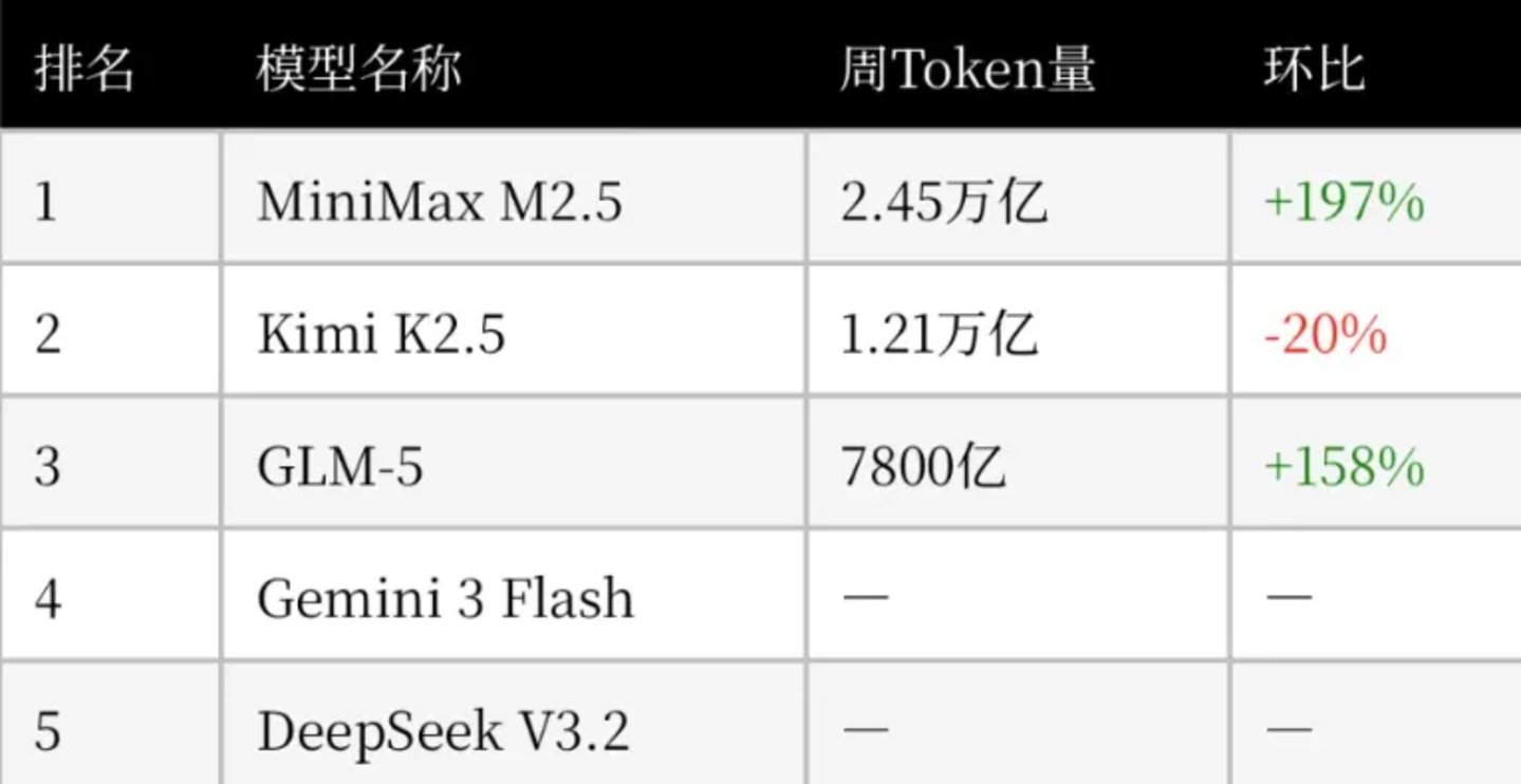 其中,MiniMax M2.5以2.45万亿token空降榜首,Kimi K2.5以1.21万亿紧随其后,智谱GLM 5和DeepSeek V3.2分列第三、第五。