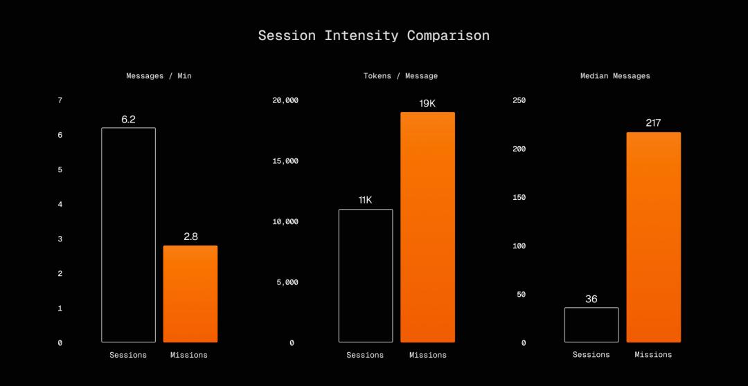 在单个Mission里,消息发送速率降至每分钟3条,但每条的token权重翻了一番。这是因为Missions把大量时间花费在执行工程任务上,而不是一直生成文字token。