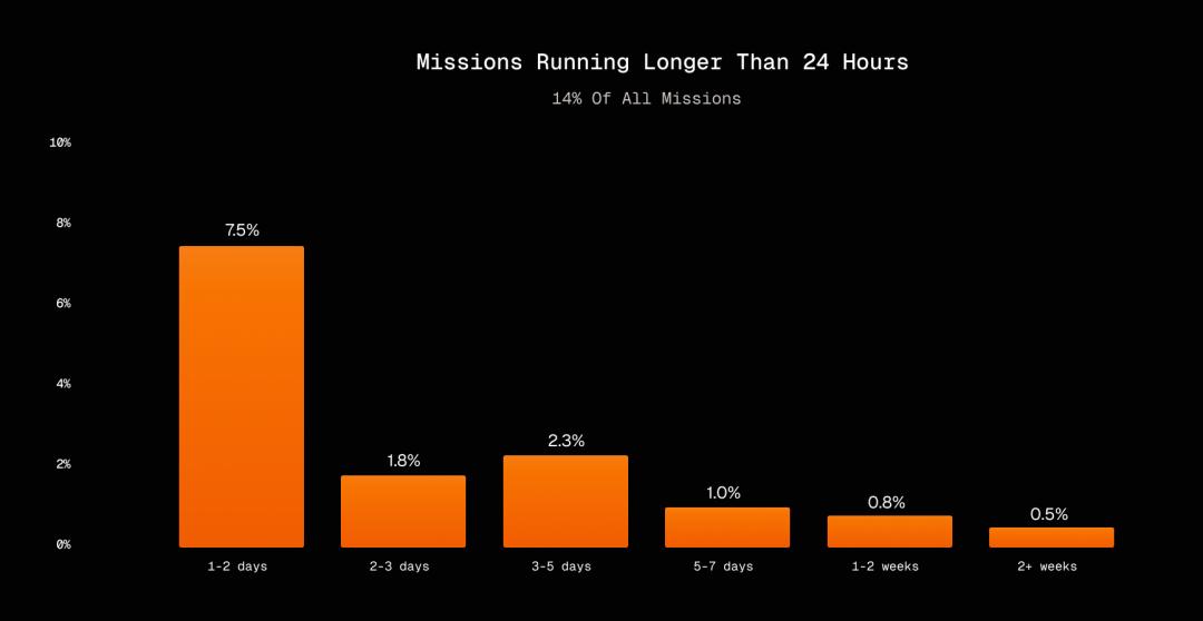 原先Droid平均对话持续约8分钟,60%的对话会在15分钟内完成,而Missions+Droid的对话普遍在2小时左右,37%的任务都会持续超过4小时。
